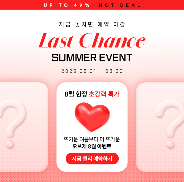 이벤트가 종료되었습니다. 가을엔 더 예뻐질지니⭐ #가을이벤트 #앵콜특가 2025-10-15 ~ 2025-11-29 이벤트가 종료되었습니다. Summer Last Chance❤️ #8월한정 #초강력특가 2025-08-01 ~ 2025-08-31 이벤트가 종료되었습니다. 오브제 럭키썸머✨ #행운의_7월 #시원한_특가모음.zip 2025-07-07 ~ 2025-08-02 이벤트가 종료되었습니다. 오브제 59제✨ #1년에 딱 1번! #59만원 균일특가 2025-05-09 ~ 2025-05-31 이벤트가 종료되었습니다. Spring Wishlist #봄맞이 이벤트 #눈성형 #코성형 #쁘띠 2025-03-19 ~ 2025-04-30 이벤트가 종료되었습니다. 비절개쌍꺼풀❤️ #후기좋은! #후기많은! #이유는_실력 2025-01-01 ~ 2025-01-31 처음 1페이지 2 게시물 검색 검색대상 제목 내용 제목+내용 검색어 필수